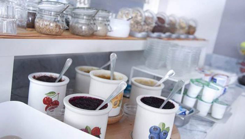 Riche buffet de petit-déjeuneravec de nombreux excellents desserts faits maison et un coin savoureuxavec jambon, fromage, œufs et pain délicieux. Et aussi du yaourt pour tous les goûts et des jus de fruits savoureux et authentiques. Graines biologiques et fruits secs, flocons de maïs, miel biologique, purées de fruits, fruits frais et centrifugeuse disponibles.